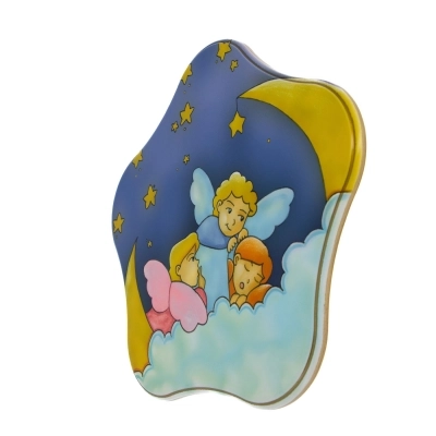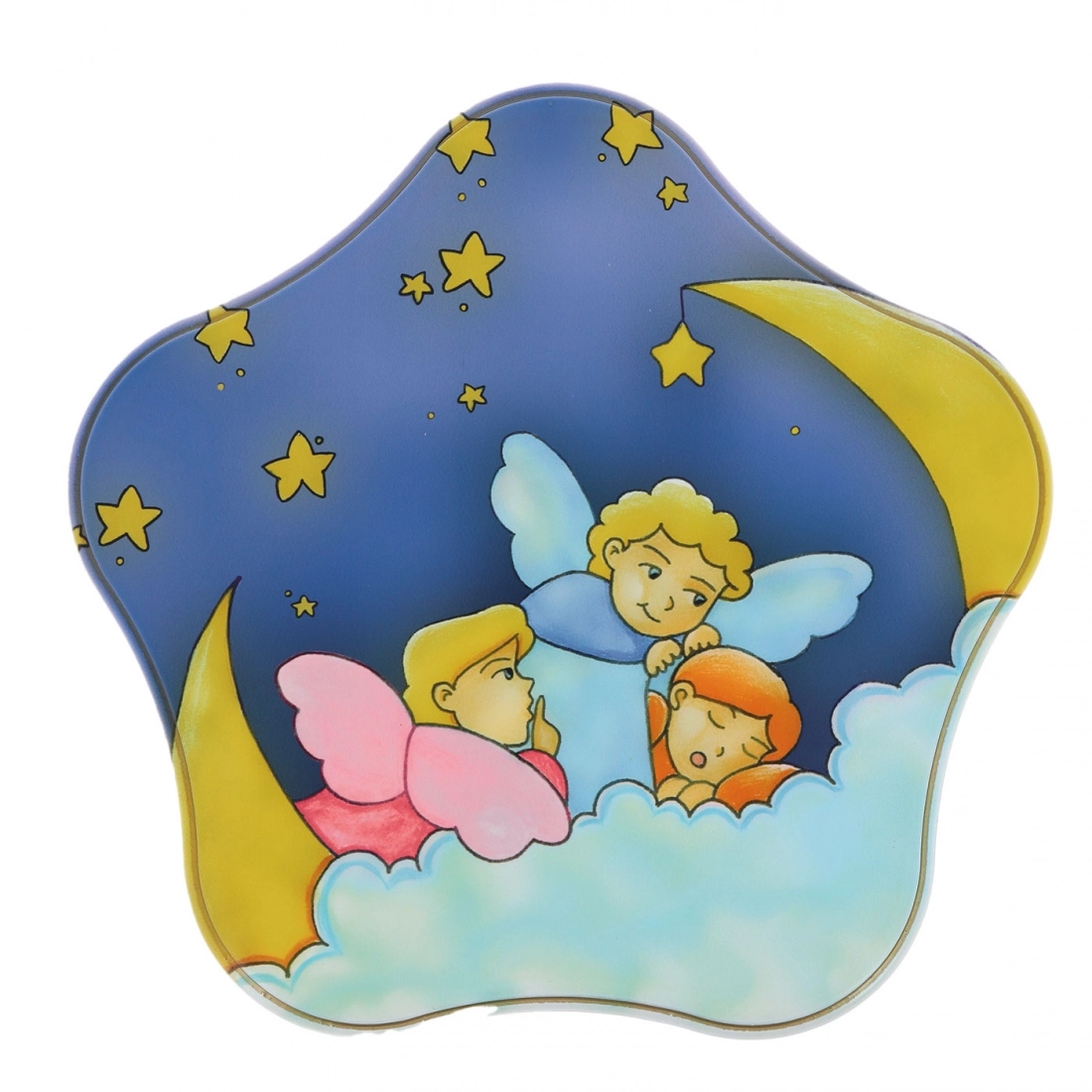 Piccolo quadro a forma di stella realizzato in legno pressato, con foro posteriore per essere appeso o da appoggio grazie alla basetta in dotazione nella confezione. Questo quadretto è decorato con una dolce illustrazione di piccoli angioletti che vegliano un bimbo che dorme. Pensiero molto carino da regalare per una nascita o per un Battesimo, per decorare la cameretta di un bambino.