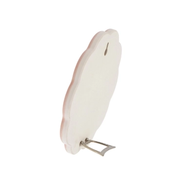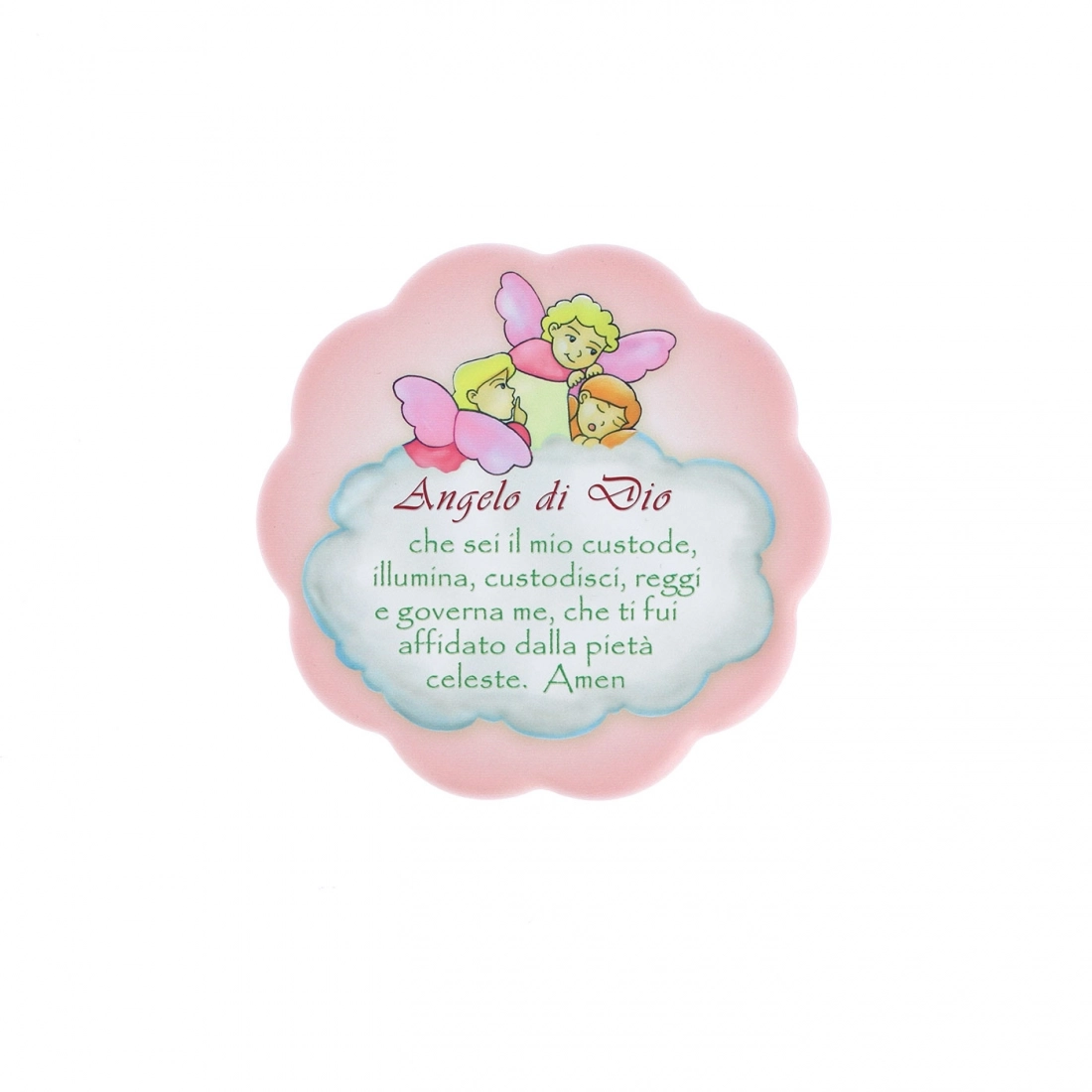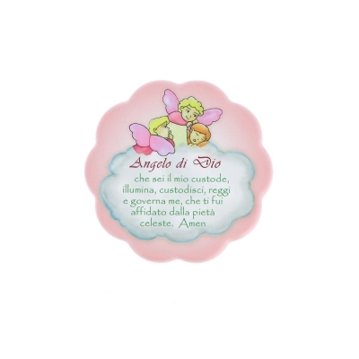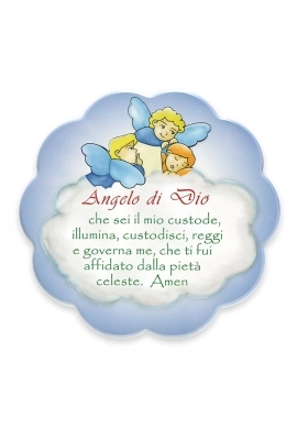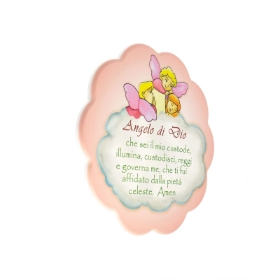 Quadretto a forma di nuvoletta realizzato in legno pressato, con foro posteriore per essere appeso o da appoggio grazie alla basetta in dotazione nella confezione. Questo piccolo quadro è decorato con una dolce illustrazione di piccoli angioletti che vegliano un bimbo che dorme e ad arricchirlo la preghiera dell' Angelo di Dio. Disponibile nelle varianti rosa e celeste. Pensiero molto carino da regalare per una nascita o per un Battesimo, per decorare la cameretta di un bambino o di una bambina.