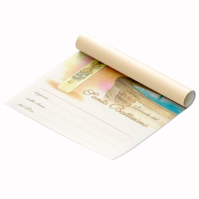 Diploma ricordo per il Santo Battesimo realizzato in carta pergamena. Simbolica è l'illustrazione della fonte battesimale, della candela e della colomba che sono gli elementi cardine del Battesimo e che ci riportano al suo significato più profondo.