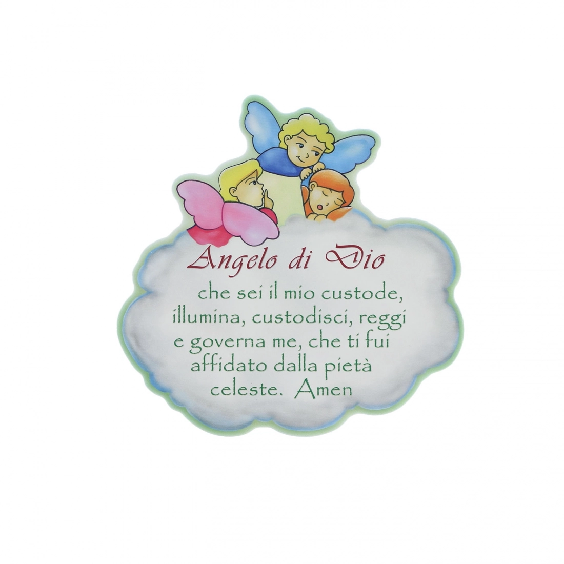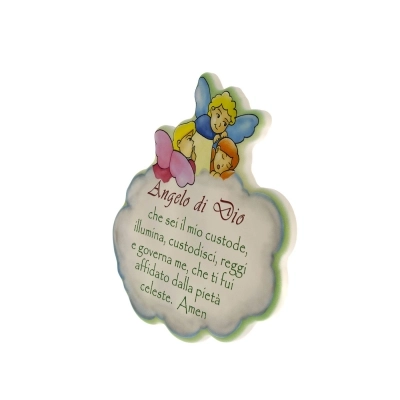 Quadretto a forma di nuvoletta realizzato in legno pressato, con foro posteriore per essere appeso o da appoggio grazie alla basetta in dotazione nella confezione. Questo piccolo quadro è decorato con una dolce illustrazione di piccoli angioletti che vegliano un bimbo che dorme e ad arricchirlo la preghiera dell' Angelo di Dio. Pensiero molto carino da regalare per una nascita o per un Battesimo, per decorare la cameretta di un bambino o di una bambina.