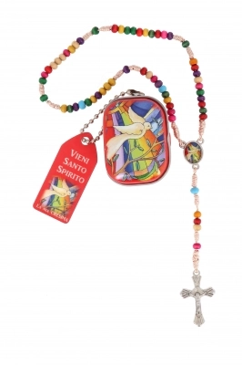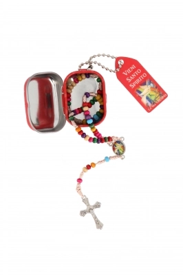 Carinissimo ricordino da regalare ai ragazzi che si apprestano al Sacramento della Cresima, composto da una piccola corona del Rosario in corda, con grani in legno colorati da 4 mm e crociera con lo Spirito Santo, inserita in una scatolina in latta di colore rosso e con stampata una colomba che simboleggia lo Spirito Santo. La scatolina in latta ha anche un piccolo gancio in metallo utile per agganciare il prodotto, ad esempio, al mazzo di chiavi.