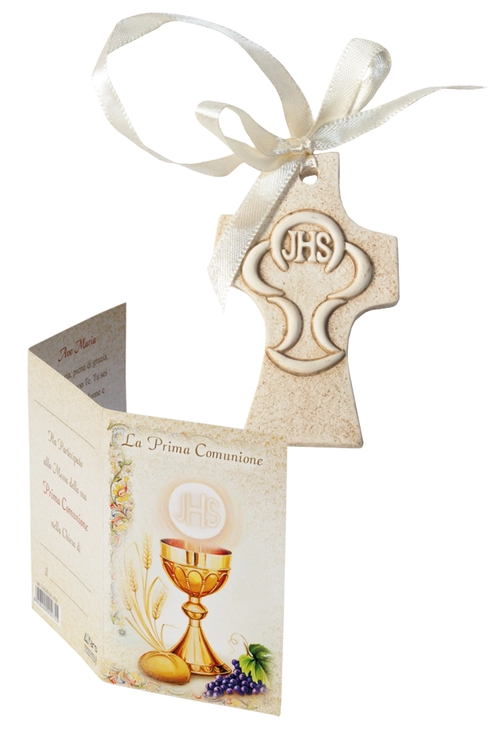 Carinissima crocetta in resina con raffigurata la classica simbologia che rappresenta la Comunione: calice, ostia e Jhs. Grazie ad un nastrino bianco è possibile appenderla. E' confezionata in una bustina con bigliettino in cui sono scritte delle preghiere per la comunione ed è personalizzabile. Potrebbe essere una carinissima idea regalo per lasciare un ricordo di grande valore ai bambini che si apprestano a ricevere questo importantissimo Sacramento, oppure potrebbe essere un'originale bomboniera da donare a chi festeggia insieme a voi un giorno così importante.