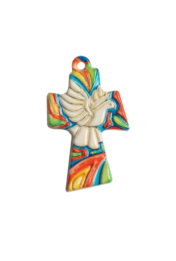 Carinissimo ciondolo crocetta in polimero, effetto ceramica, con raffigurata la classica simbologia che rappresenta lo Spirito Santo e quindi adatto per la Cresima: la colomba con raggi. Grazie ad un cordoncino rosso, dalla lunghezza di 35 cm, è possibile indossarla al collo. E' confezionata in una bustina con bigliettino come ricordo della Cresima e delle preghierine. Potrebbe essere una carinissima idea regalo per lasciare un ricordo di grande valore ai ragazzi che si apprestano a ricevere questo importantissimo Sacramento.