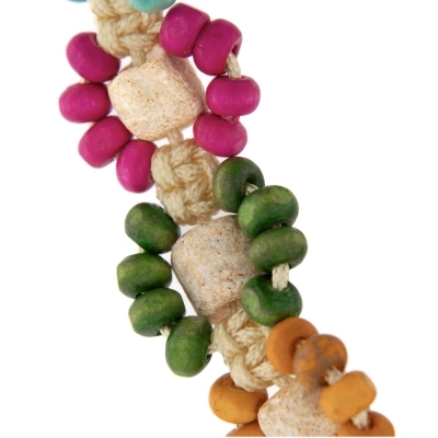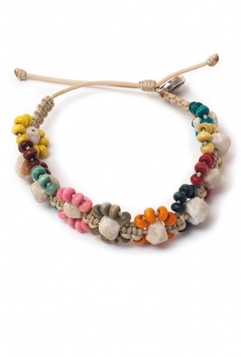 Bracciale in corda color avorio, composto da 10 grani in pietra, circondati da grani più piccoli in legno, che formano dei carinissimi fiorellini colorati. Il bracciale è allungabile, quindi adatto a tutte le tipologie di polso. Carinissimo pensiero da donare in qualsiasi occasione, anche a delle bambine. Pratico e leggero da indossare tutti i giorni.