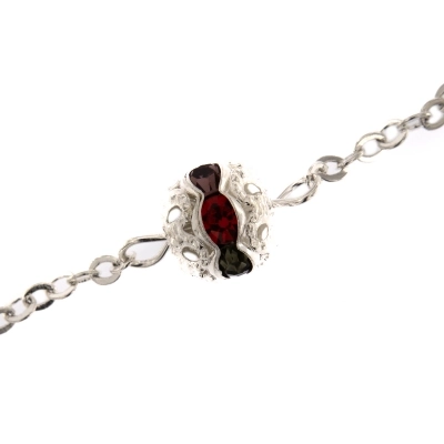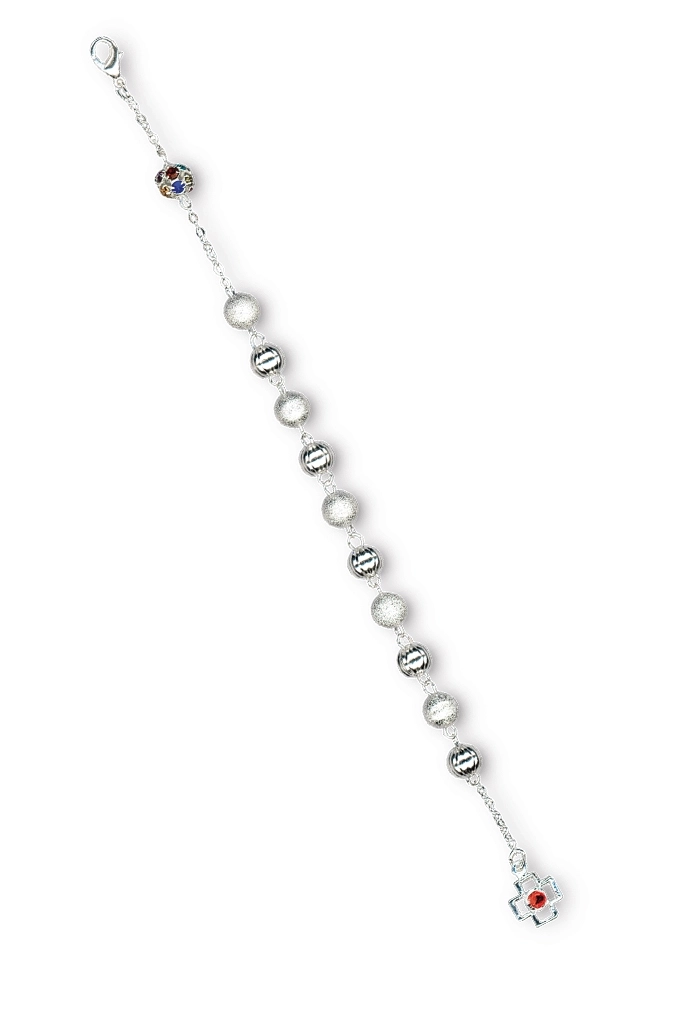 Fine e delicato bracciale composto da 10 grani in metallo che alternano due diverse lavorazioni, una sabbiata e l'altra lavorata con delle righine verticali che percorrono tutto il grano. Il grano in cui si recita il "Padre Nostro" è sempre in metallo, con lavorazione tipo filigrana, e una strisciolina di strass colorati. Alla fine del bracciale è posizionata una crocetta forata con uno strass centrale colorato. Il bracciale è dotato di gancetto che ne consente l'apertura ed è quindi facilmente indossabile.