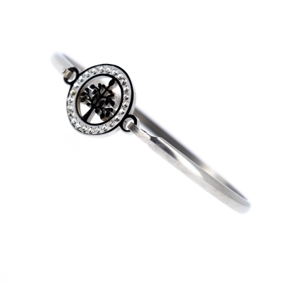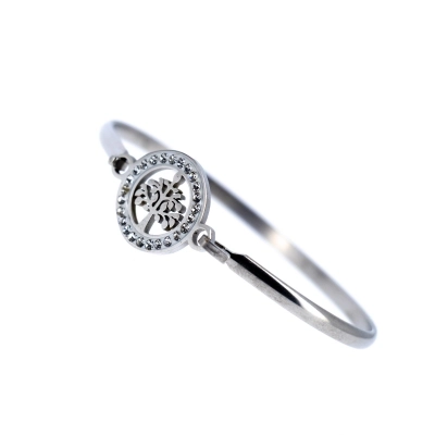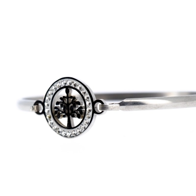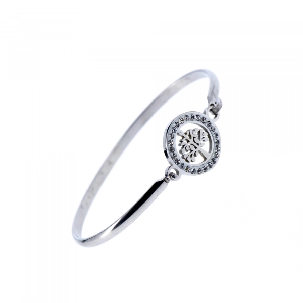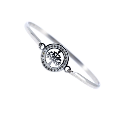 Bracciale rigido in acciaio inossidabile con al centro un albero della vita circondato di strass e chiusura a gancio. L' albero della vita simboleggia la famiglia e le relazioni, poiché le radici rappresentano le origini e i rami simboleggiano le generazioni future. Nella tradizione religiosa del cristianesimo l'albero della vita ha anche connotazioni spirituali e di immortalità.