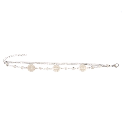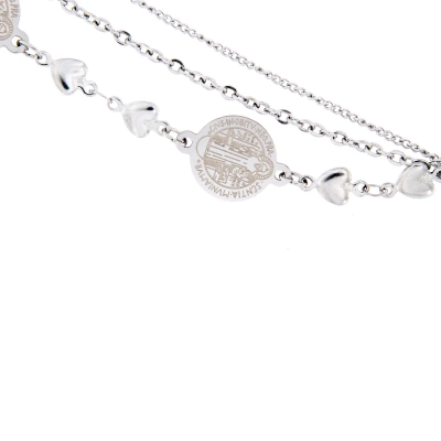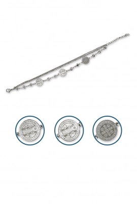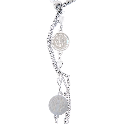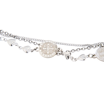 Bracciale in acciaio inossidabile a triplo filo e chiusura a moschettone. Particolare uno dei fili a catena di cuoricini con tre medaglie di San Benedetto. La medaglia di San Benedetto è un simbolo cristiano che rappresenta la protezione e la benedizione. Essa riporta l'immagine di San Benedetto da Norcia, fondatore dell'Ordine Benedettino, e contiene diverse iscrizioni e simboli che richiamano la sua vita e i suoi insegnamenti. La medaglia è spesso utilizzata dai fedeli come talismano di protezione e come segno di devozione.