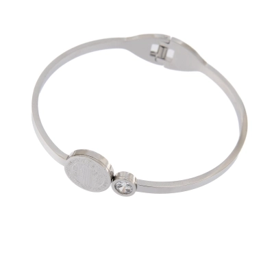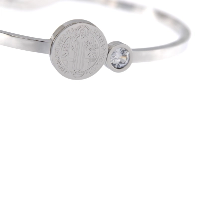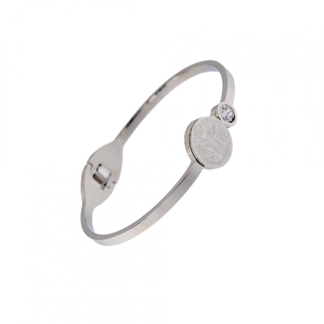 Bracciale rigido in acciaio inossidabile con chiusura a molla, con medaglia di San Benedetto e strass. a. Elegante da indossare è ideale da regalarsi o regalare in qualsiasi occasione. La medaglia di San Benedetto è un simbolo cristiano che rappresenta la protezione e la benedizione. Essa riporta l'immagine di San Benedetto da Norcia, fondatore dell'Ordine Benedettino, e contiene diverse iscrizioni e simboli che richiamano la sua vita e i suoi insegnamenti. La medaglia è spesso utilizzata dai fedeli come talismano di protezione e come segno di devozione a San Benedetto.