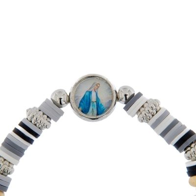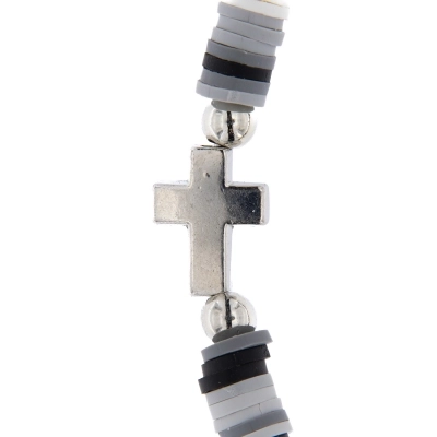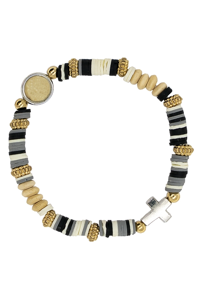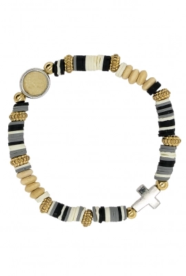 Bracciale elastico, composto elementi in gomma e plastica, intervallati da grani in metallo dorato lavorati dalla forma ovale. Ad arricchire tutto il bracciale è presente una crocetta in metallo e una medaglia. Ideale da regare in qualsiasi occasione. Comodo e leggero da indossare quotidianamente.
