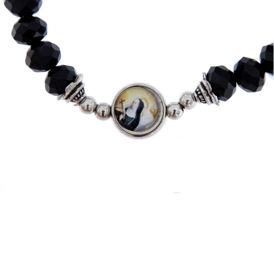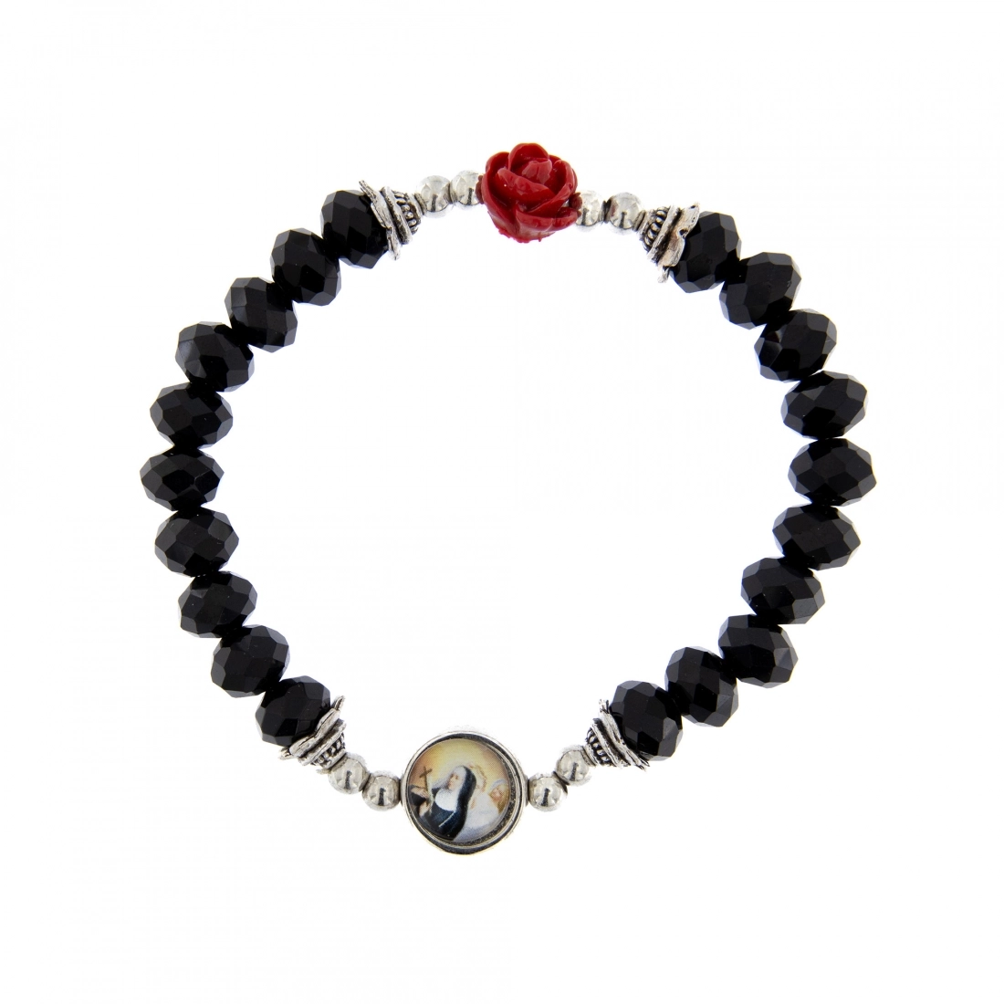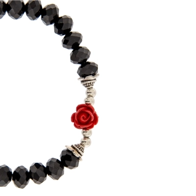 Bracciale elastico, composto da venti grani sfaccettati di colore nero. Ad arricchire tutto il bracciale, è presente una rosa in polimero rossa e una medaglia. Ideale da regare in qualsiasi occasione. Comodo e leggero da indossare quotidianamente.