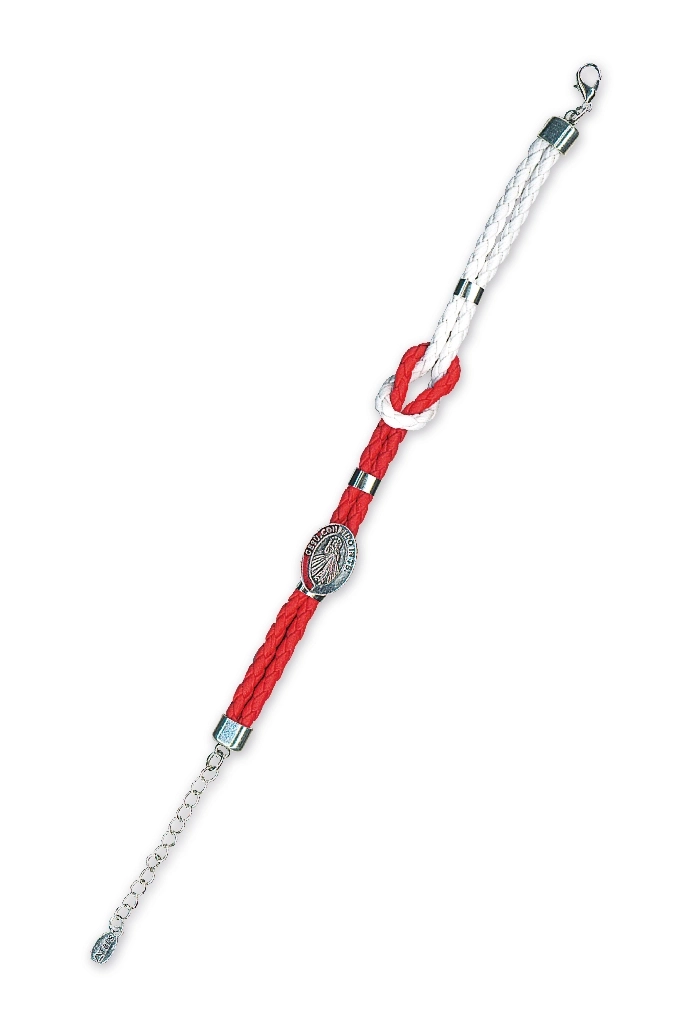 Bracciale composto da due cordini in ecopelle intrecciati, uno bianco e uno rosso con al centro una medagia di Gesù Misericordioso e chiusura a moschettone.