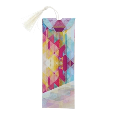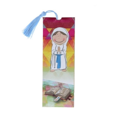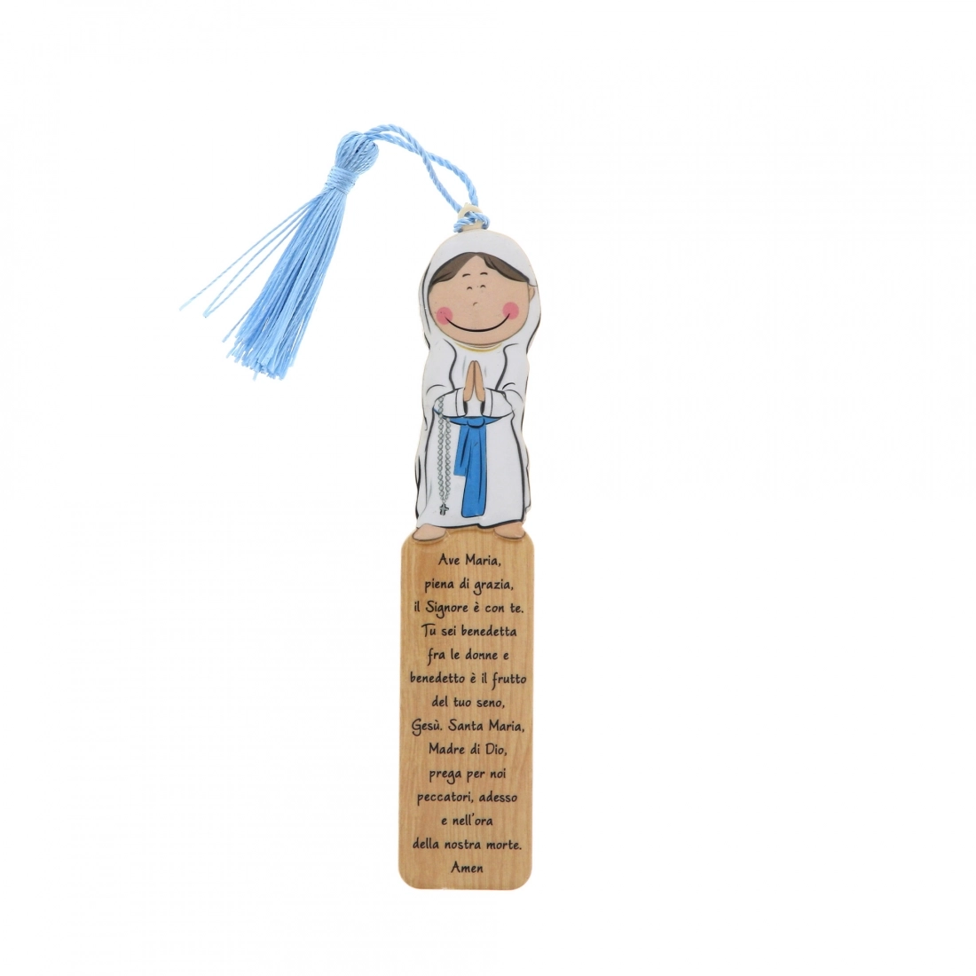 Simpatico segnalibro in polimero con sagoma e immagine raffigurante la Madonna di Lourdes e preghiera dell'Ave Maria sulla parte frontale. Il segnalibro è corredato di fiocchetto ed è inserito all'interno di una confezione in cartoncino che lo rende particolarmente adatto ad essere regalato.