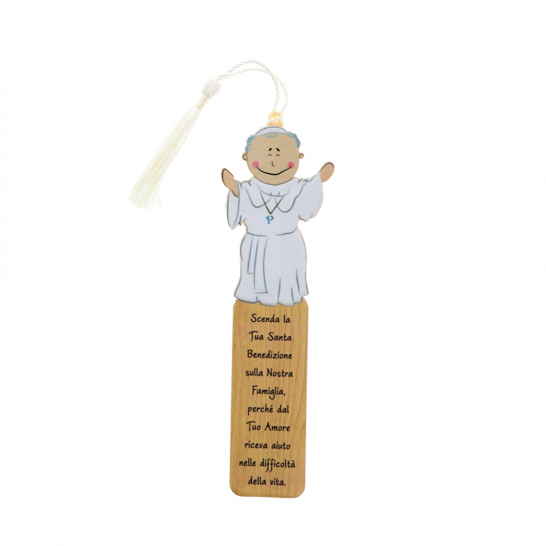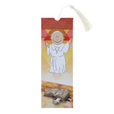 Simpatico segnalibro in polimero con sagoma e immagine raffigurante Papa Giovanni Paolo II e preghiera sulla parte frontale. Il segnalibro è corredato di fiocchetto ed è inserito all'interno di una confezione in cartoncino che lo rende particolarmente adatto ad essere regalato.
