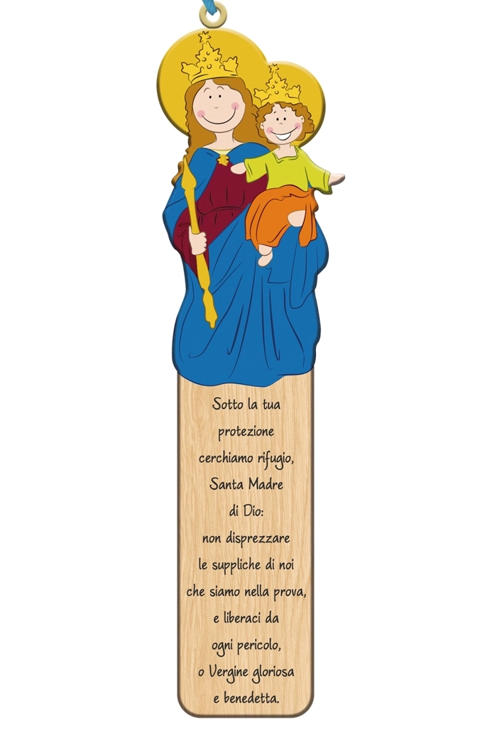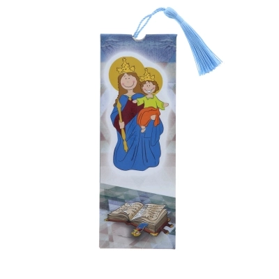 Simpatico segnalibro in polimero con sagoma e immagine raffigurante Maria SS. Ausiliatrice e preghiera sulla parte frontale. Il segnalibro è corredato di fiocchetto ed è inserito all'interno di una confezione in cartoncino che lo rende particolarmente adatto ad essere regalato.