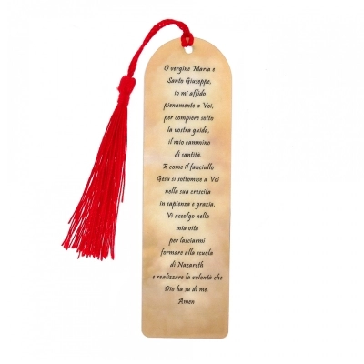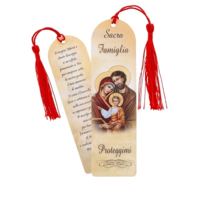 Pratico segnalibro plastificato con all'estremità una nappina colorata e preghiera sul retro. Soggetto: Sacra Famiglia.