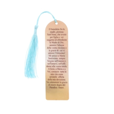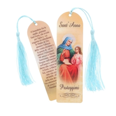 Pratico segnalibro plastificato con all'estremità una nappina colorata e preghiera sul retro. Soggetto: Sant'Anna.