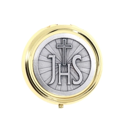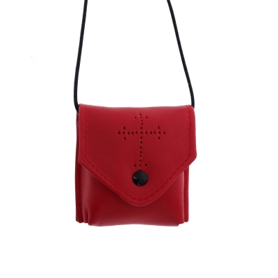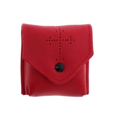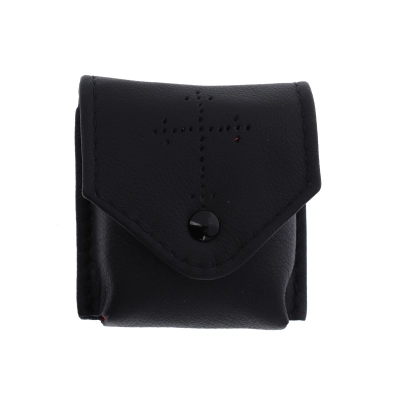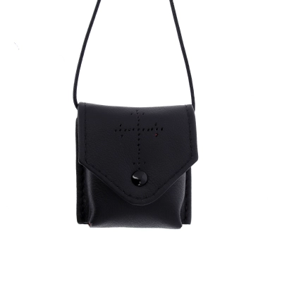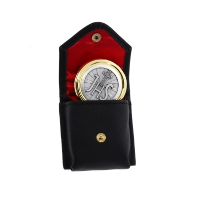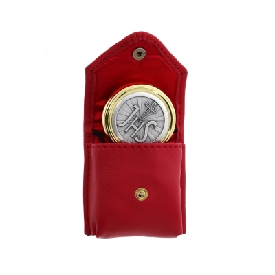 Piccolo astuccio porta teca in pelle, con chiusura a bottone. Morbido al tatto, l'astuccio nero ha l'interno in fodera rossa, oltre ad una cordicella nera, per essere anche portato al collo. L'astuccio è disponibile nelle colarazioni rosso e nero. In aggiunta è compresa una piccola teca dorata, porta ostie, con una decorazione in peltro, riportante in rilievo le lettere IHS. Realizzata in Italia da un'azienda artigianale che opera da anni nel settore della pelletteria.