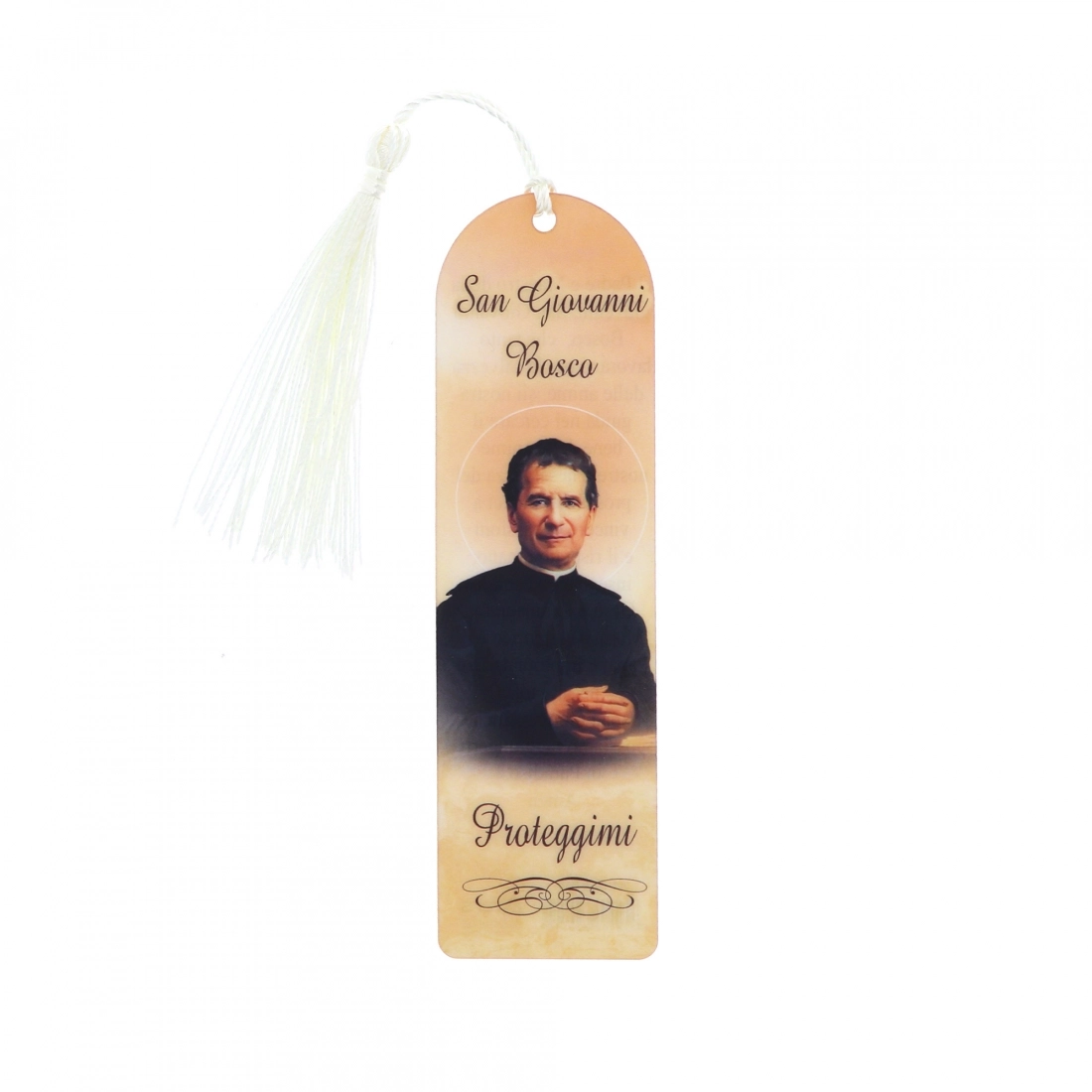 Pratico segnalibro plastificato con all'estremità una nappina colorata e sul retro una preghiera. Soggetto: San Giovanni Bosco.