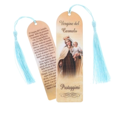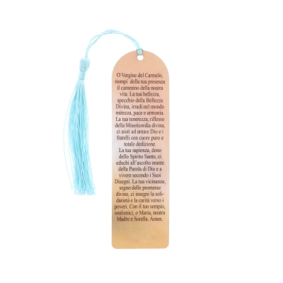 Pratico segnalibro plastificato con all'estremità una nappina colorata e sul retro una preghiera. Soggetto: Madonna del Carmine.