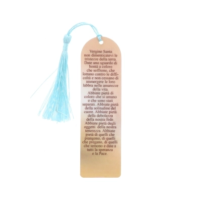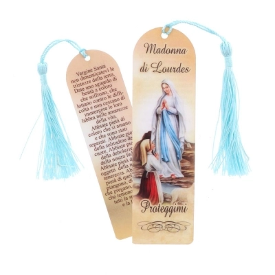Pratico segnalibro plastificato con all'estremità una nappina colorata e sul retro una preghiera. Soggetto: Madonna di Lourdes.