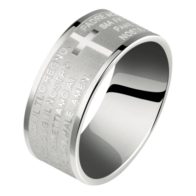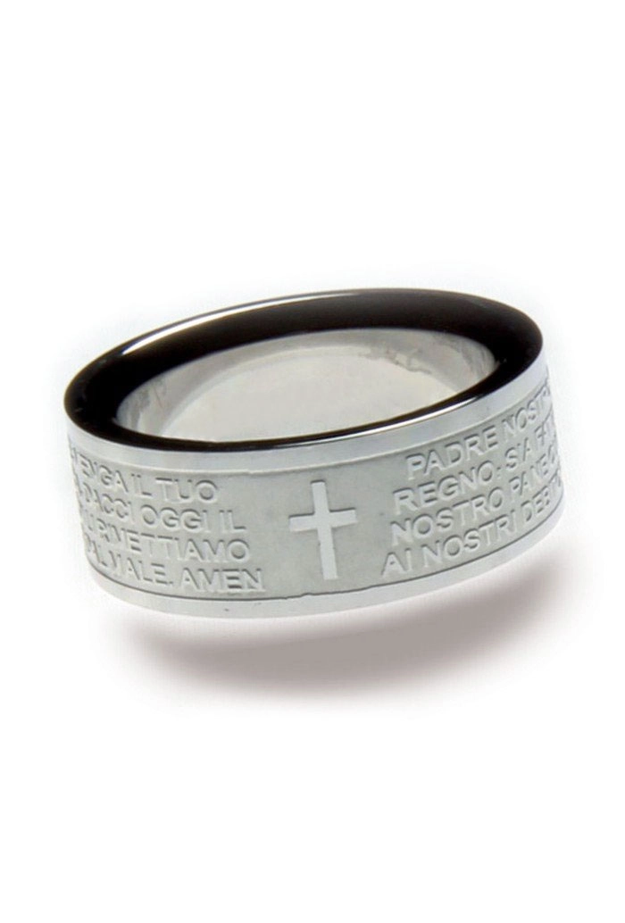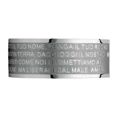 Anello unisex in acciaio con la preghiera del Padre Nostro in lingua italiana con finitura lucida, su fondo satinato.