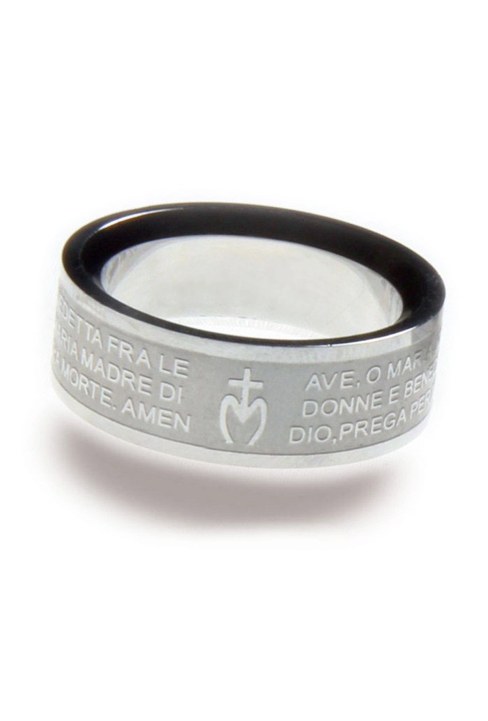 Anello unisex in acciaio con la preghiera dell' Ave Maria in lingua italiana con finitura lucida, su fondo satinato.