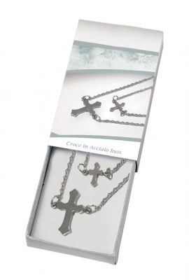 Catenina in acciaio inossidabile formata da doppia catenina di lunghezze diverse con ciondoli croce e chiusura a moschettone. Molto bello e curato il packaging che si apre a cassetto e presenta un' illustrazione nella parte anteriore. La croce è un simbolo di fede, in particolare nel cristianesimo, dove rappresenta la crocifissione di Gesù Cristo e il suo sacrificio per l'umanità. Indossare un ciondolo a forma di croce simboleggia dunque la propria fede, la protezione divina o un legame spirituale. Prodotto molto carino da regalare.