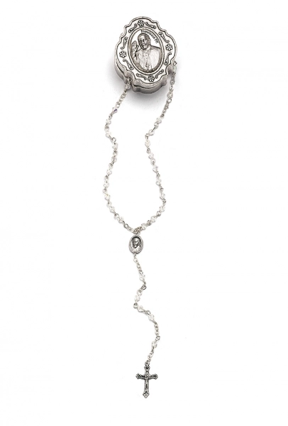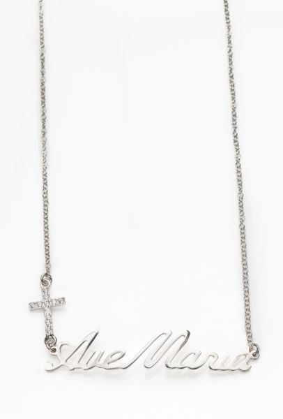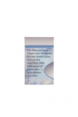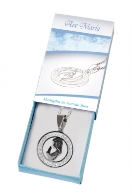 Catenina in acciaio inossidabile e ciondolo lucido con Madonna che prega, circondata di strass . Molto bello e curato il packaging che si apre a cassetto e presenta un' illustrazione nella parte anteriore e la preghiera dell'Ave Maria nella parte posteriore della confezione. Prodotto molto carino da regalare.