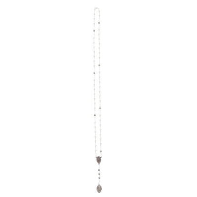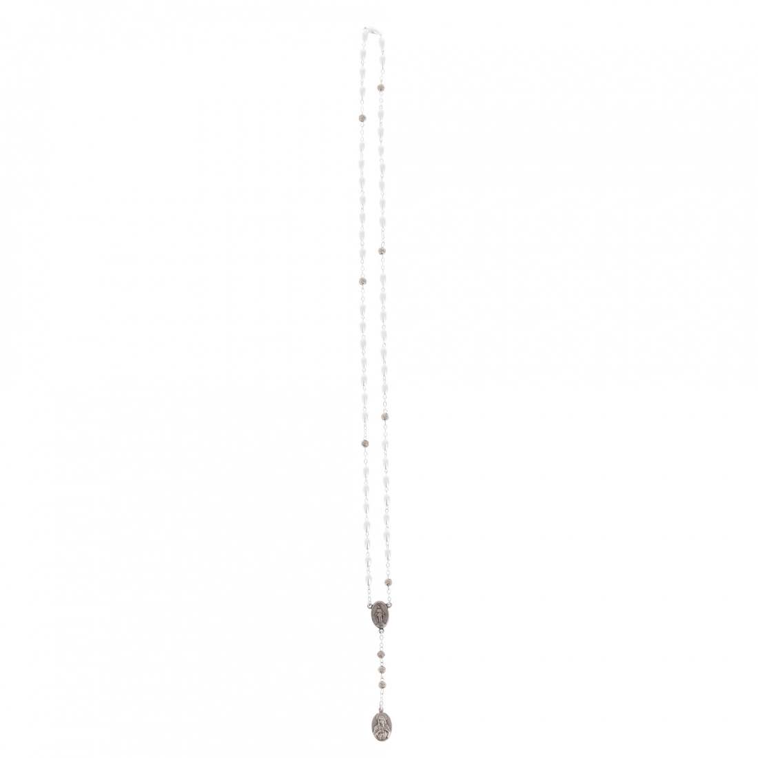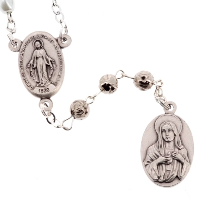La corona è composta da 7 poste di 7 grani, a forma di lacrima di lunghezza 8 mm, in madreperla bianchi, intervallati da grani, di diametro 6 mm, in metallo a forma di rosellina. La crociera è la medaglia Miracolosa e sulla medaglia finale è raffigurata la Madonna delle Lacrime. I gruppi dei misteri sono sette, uno per ogni giorno della settimana: gioia, luce, dolore, gloria, sapienza, giustizia e misericordia. Le meditazioni parlano delle lacrime d’amore della Madonna per l’umanità, che da sole esprimono la commozione della Madre che vede i suoi figli lontani da Dio.
