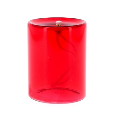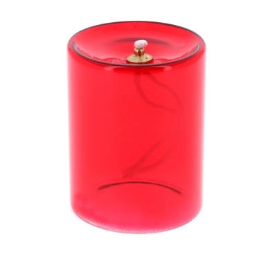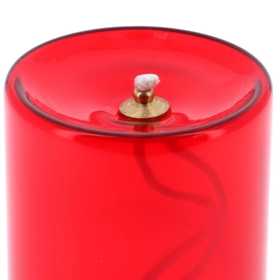 Bicchiere in vetro rosso integrato per cera liquida. Questo bicchiere viene usato per il Santissimo, è chiuso in alto ed è completo di gigler e stoppino. Ha una capienza di 350 cc e una durata di circa 4 giorni.