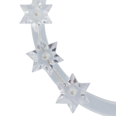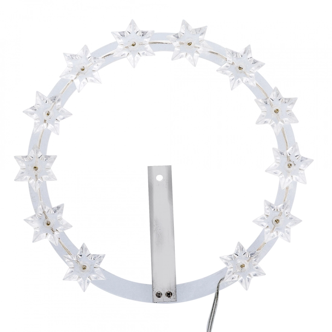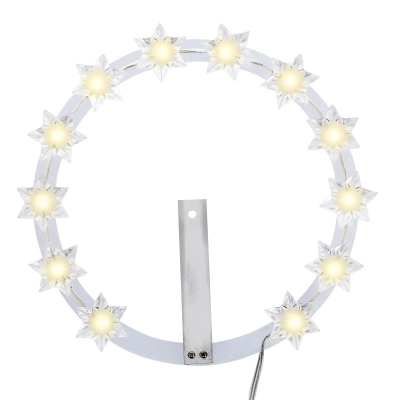 Stellario in plexiglass trasparente con 12 stelle posizionate su dei led a luce gialla. Questa aureola luminosa è adatta per qualsiasi tipologia di statua, ma più comunemente viene utilizzata per le statue raffiguranti la Madonna. Il diametro dello stellario è di 15 cm. Funziona tramite corrente elettrica ed infatti all'interno della scatola, oltre allo stellario, è presente un trasformatore dotato di cavo dalla lunghezza di 190 cm. Ideale per utilizzo anche esterno. Trasformatore con presa europea.