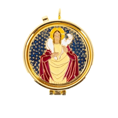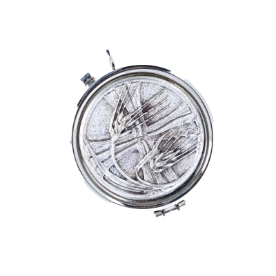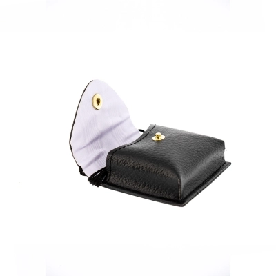 Portateca in pelle, delle dimensioni di 8x8x5 cm. di colore nero, con chiusura centrale. Contiene una teca argentata con spighe di grano in rilievo, una dorata con placca smaltata, un purifichino, il crocifisso e una comoda cordicella. La pelle è di ottima qualità e la doppia tasca rende il prodotto molto versatile.