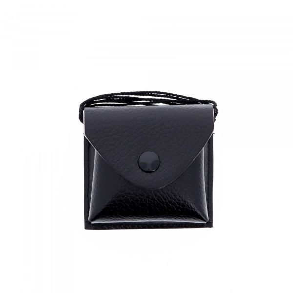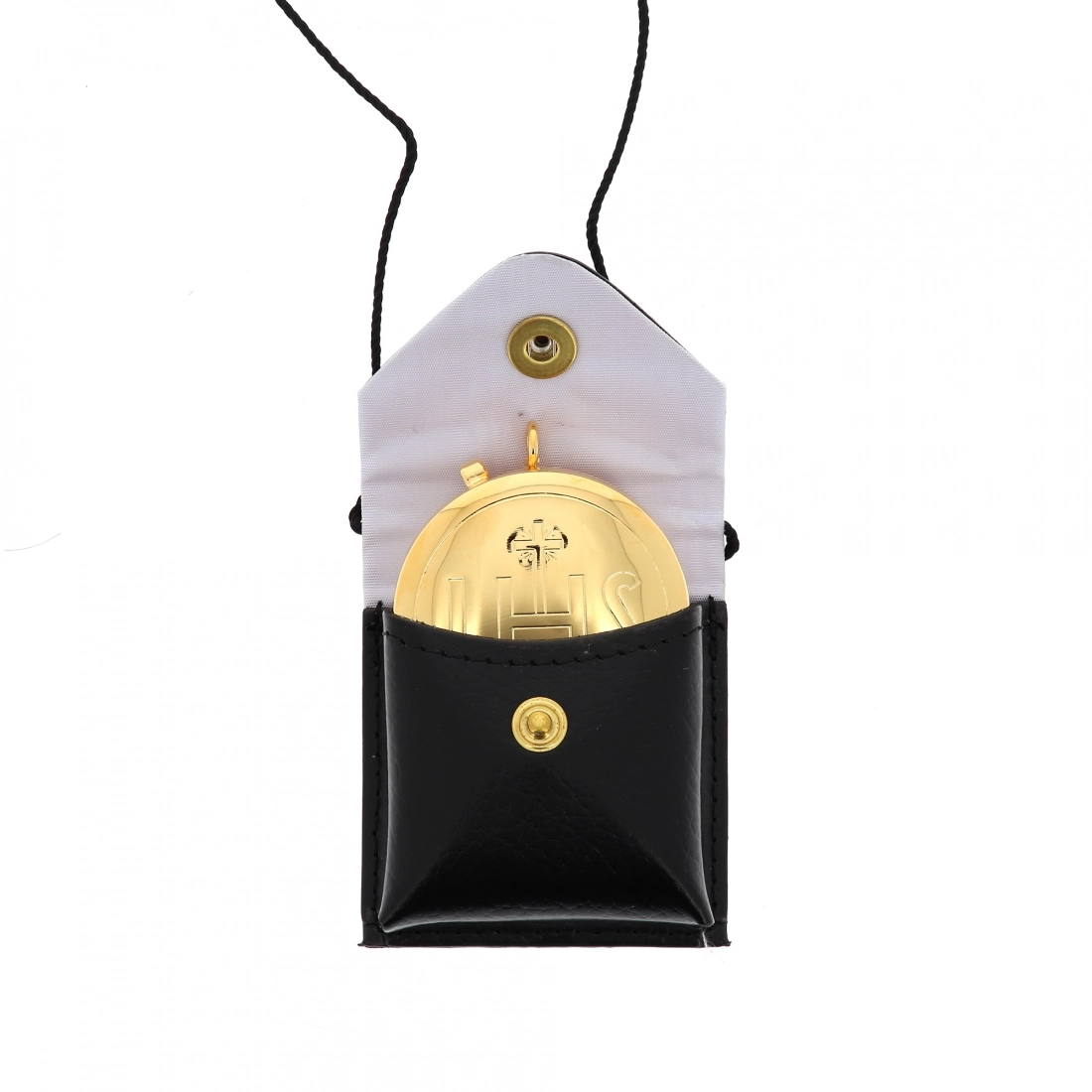 Astuccio portateca in similpelle nera con l’interno in tessuto bianco, dotato di un pratico cordino. Il portateca contiene la teca (del diametro di 5,4 cm), realizzata in metallo dorato con incisione del simbolo IHS. Prodotto in Italia con materiali di ottima qualità.