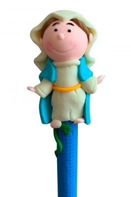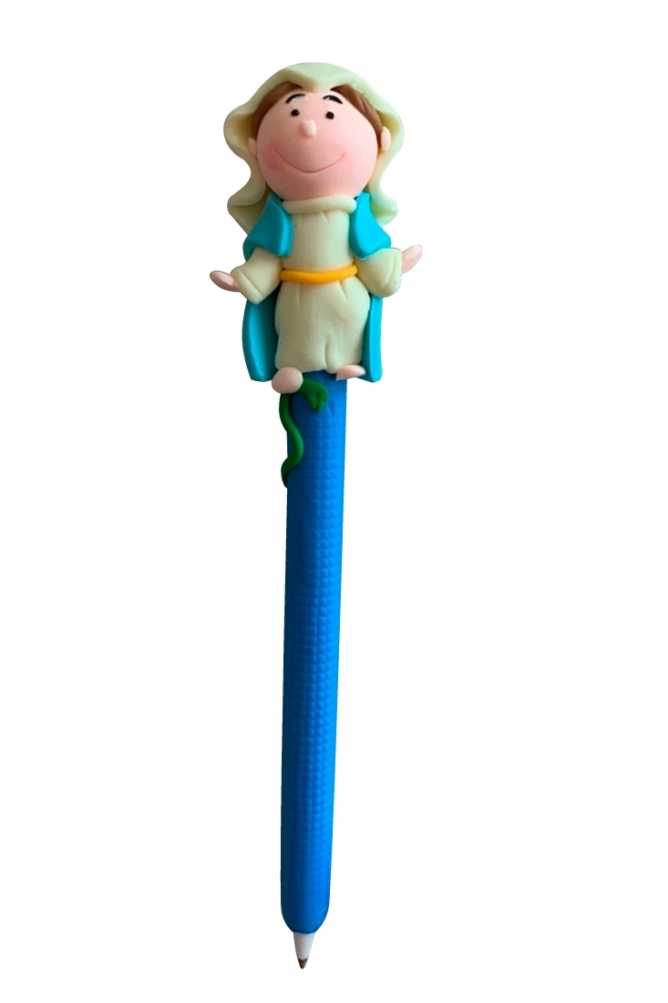 Simpatica penna con raffigurazione della Madonna in pasta di fimo colorato, con piccolo tappo di chiusura. Il fimo è una pasta sintetica polimerica che diventa modellabile con il calore delle mani. Articolo molto carino da regalare ai bambini.