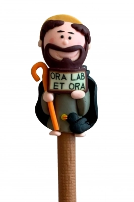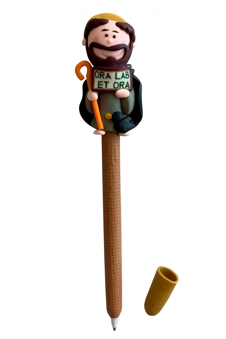Simpatica penna con raffigurazione di San Benedetto in pasta di fimo colorato, con piccolo tappo di chiusura. Il fimo è una pasta sintetica polimerica che diventa modellabile con il calore delle mani. Articolo molto carino da regalare ai bambini.