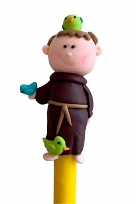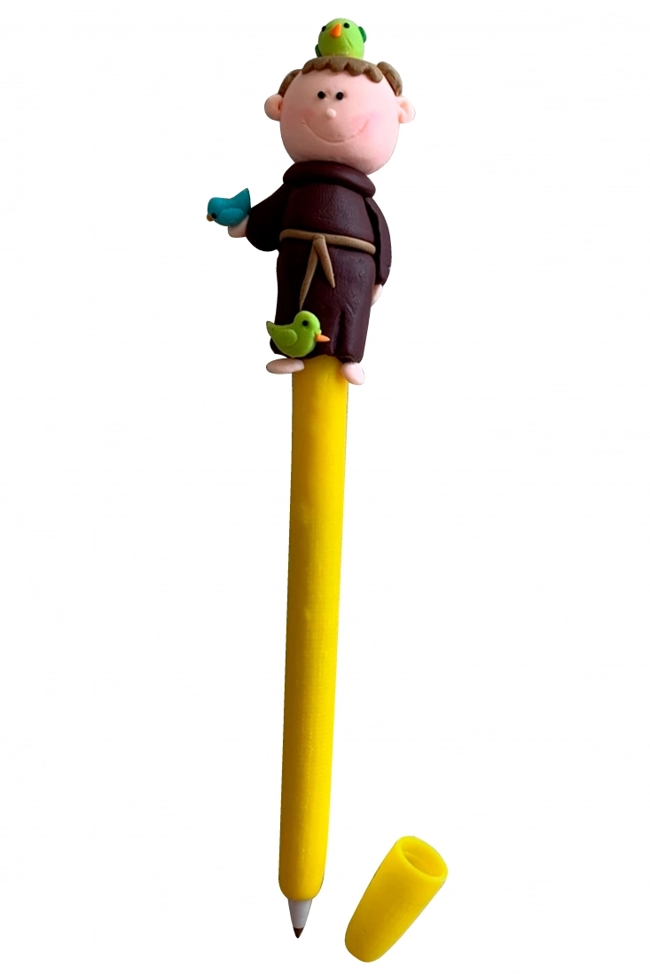 Simpatica penna con raffigurazione di San Francesco in pasta di fimo colorato, con piccolo tappo di chiusura. Il fimo è una pasta sintetica polimerica che diventa modellabile con il calore delle mani. Articolo molto carino da regalare ai bambini.