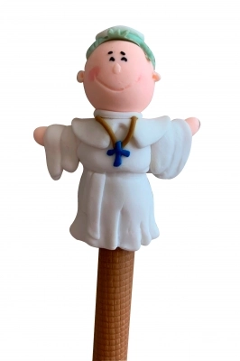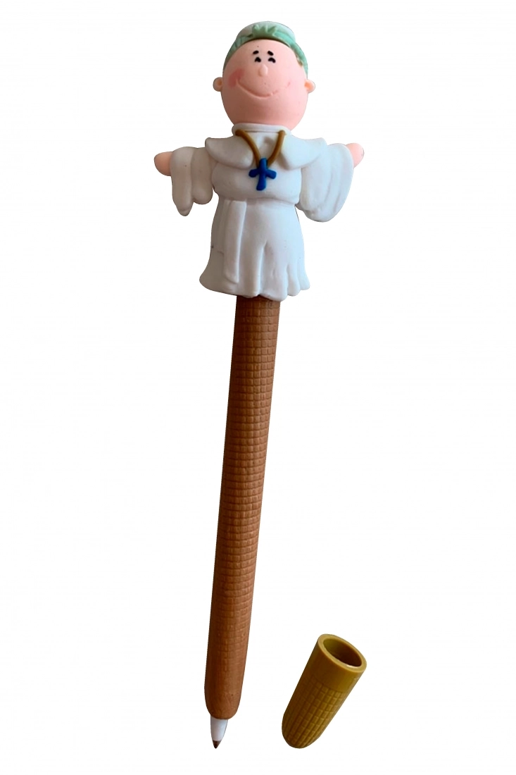 Simpatica penna con raffigurazione di Papa Giovanni Paolo II in pasta di fimo colorato, con piccolo tappo di chiusura. Il fimo è una pasta sintetica polimerica che diventa modellabile con il calore delle mani. Articolo molto carino da regalare ai bambini.