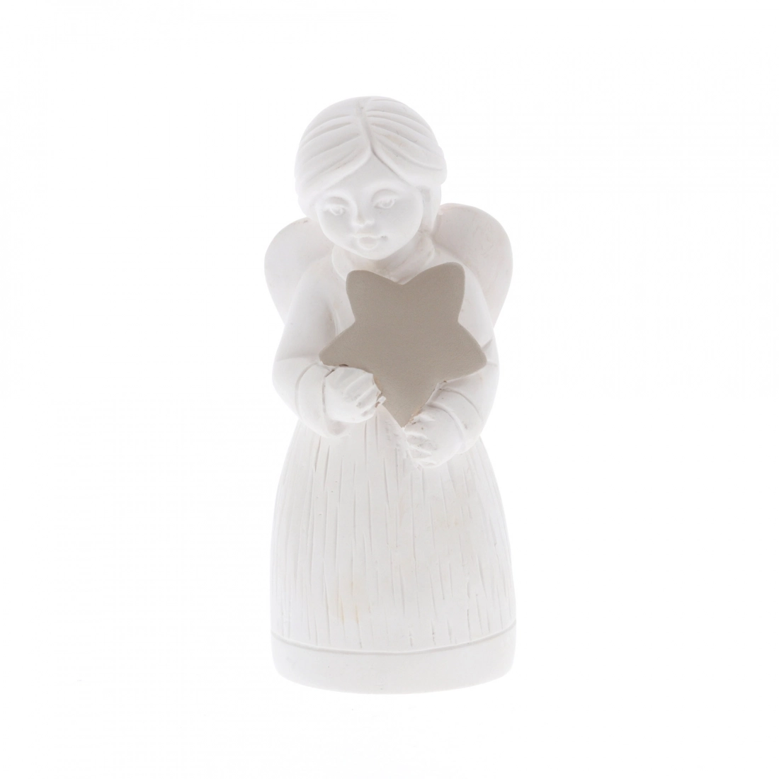 Carinissimo angelo che regge con amore una stella, realizzato in resina bianca e stella color tortora. L'espressione è decisamente dolce ed è adatto ad essere inserito come soprammobile in qualsiasi ambiente della casa. L'articolo è corredato di elegante scatola di colore bianca e tortora. Articolo molto carino da regalare per qualsiasi occasione speciale o da usare come bomboniera.