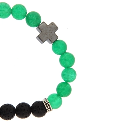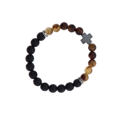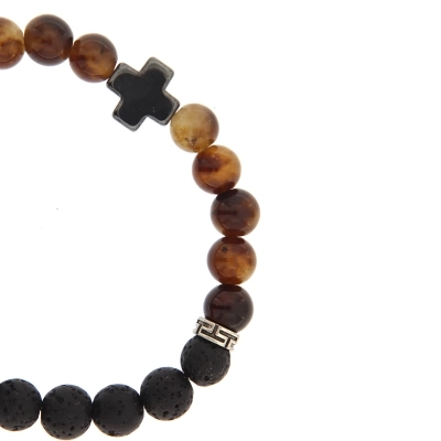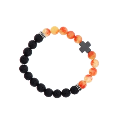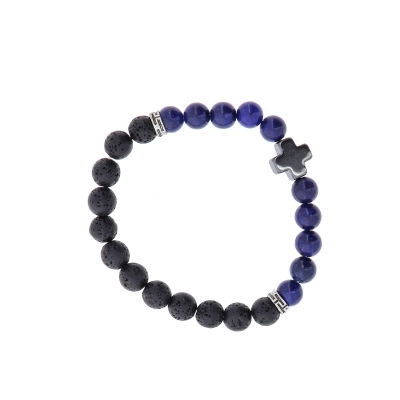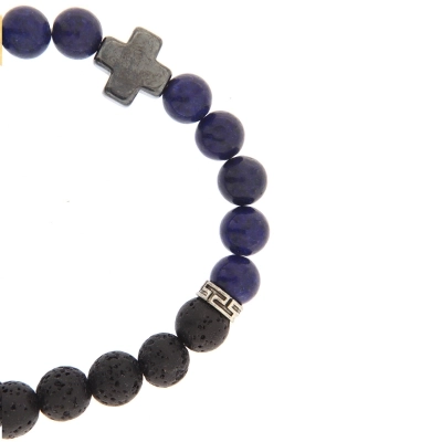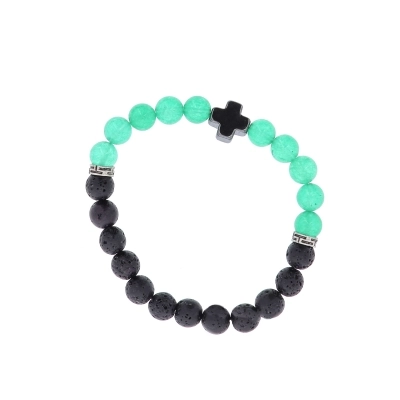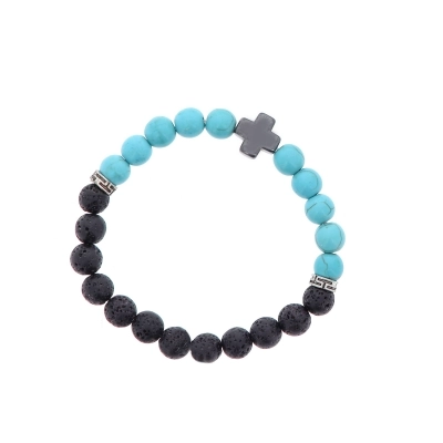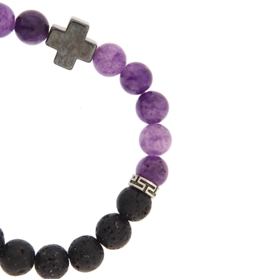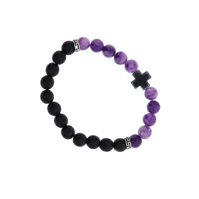 Bracciale dalla linea moderna, elegante e di ottima qualità. Composto da pietre vulcaniche nere e porose e pietre dure sfumate gda 0,8 mm. La legatura elasticizzata rende il bracciale confortevole e in grado di adattarsi a ogni misura di polso. Le pietre dure sono 10 e al centro troviamo una croce greca. Il bracciale è accompagnato da un cartellino che spiega il significato del colore delle pietre. L'articolo è prodotto in Italia da un’azienda leader nella produzione di articoli religiosi ed è disponibile in diverse colorazioni: viola – rosso – marrone – ambra – blu – verde - turchese.