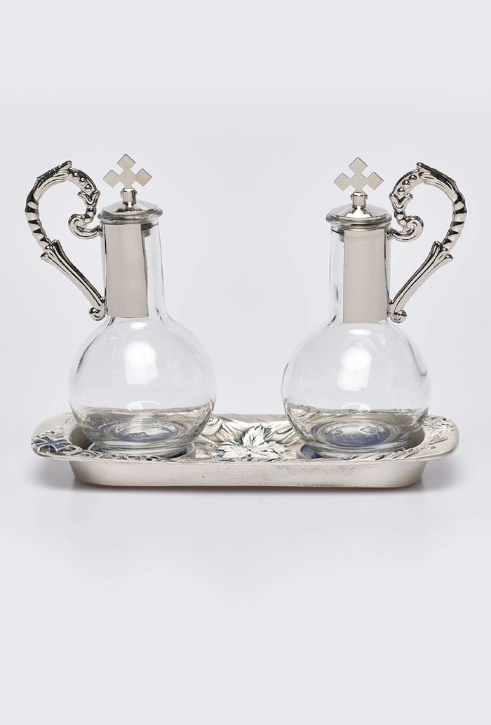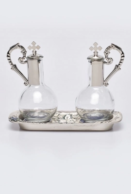 Coppia di ampolline in vetro con capienza di 100 ml e manici tappi e piatto in ottone nichelato. La stabilità delle ampolle è garantita da un sistema di ancoraggio tramite magnete permanente. Infatti, nella base dell' ampolla e sul piattino sono posti dei magneti con polarità opposta che si attraggono impedendo all' ampollina di oscillare. Dimensione piatto: 19X9 cm. Altezza ampollina 13 cm.