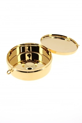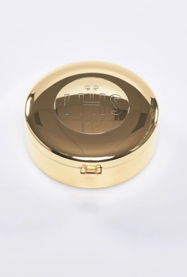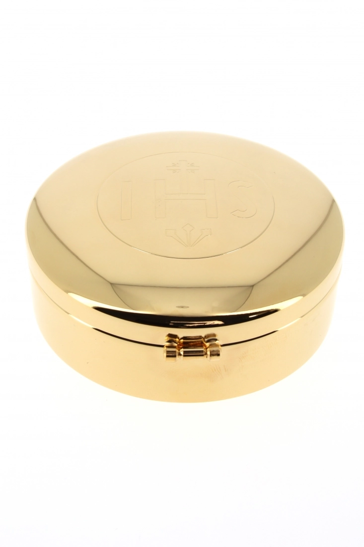 Teca porta ostie con incisione JHS in ottone dorato sia internamente che esternamente. La teca eucaristica è un contenitore per la conservazione delle ostie consacrate, ovvero l'Eucaristia, tesoro più grande da condividere, dall'altare della celebrazione all'abitazione dei fedeli. Ideale anche per separare le ostie dei celiaci.