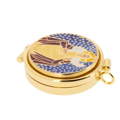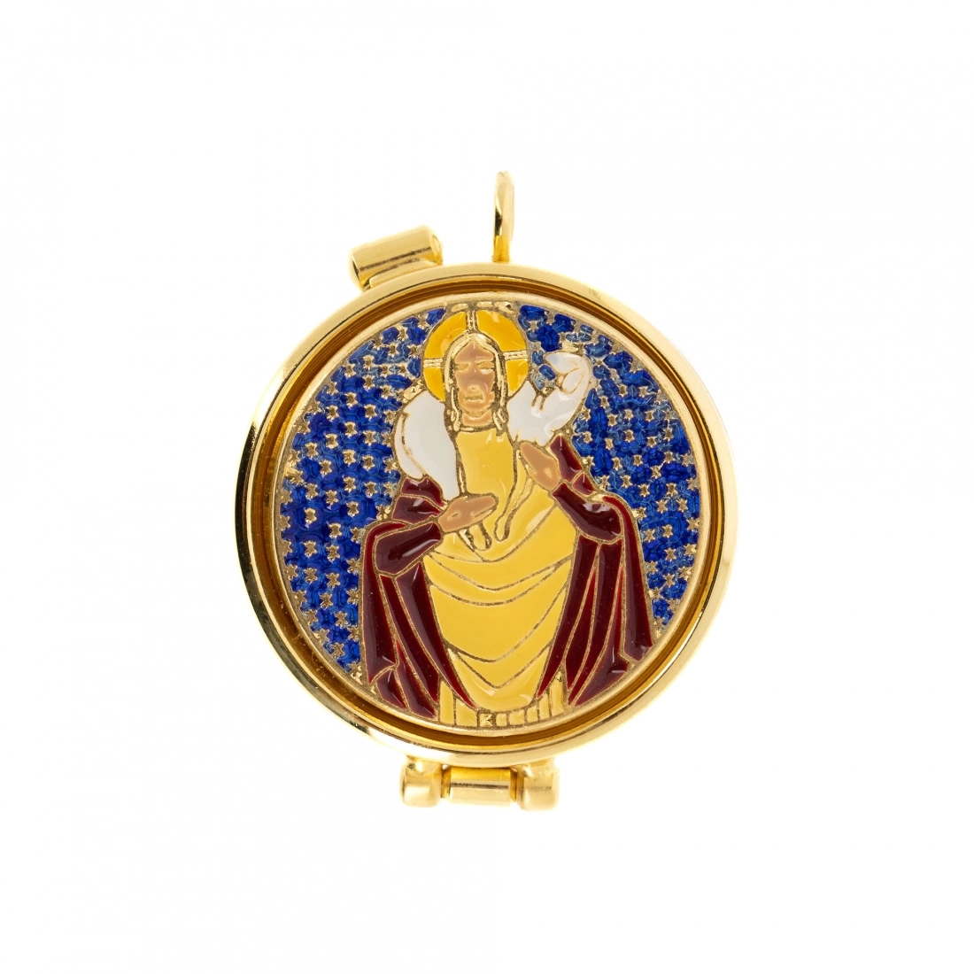 Teca porta ostie con placca raffigurante Gesù Buon Pastore, realizzata in ottone dorato. La teca eucaristica è un contenitore per la conservazione delle ostie consacrate, ovvero l'Eucaristia, tesoro più grande da condividere, dall'altare della celebrazione all'abitazione dei fedeli. Ideale anche per separare le ostie dei celiaci.