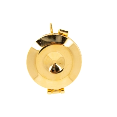 Teca porta ostie con placca raffigurante Gesù Buon Pastore, realizzata in ottone dorato. La teca eucaristica è un contenitore per la conservazione delle ostie consacrate, ovvero l'Eucaristia, tesoro più grande da condividere, dall'altare della celebrazione all'abitazione dei fedeli. Ideale anche per separare le ostie dei celiaci.