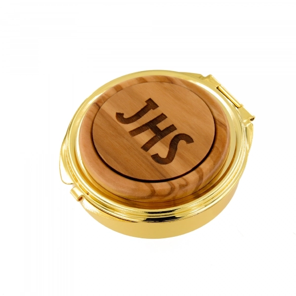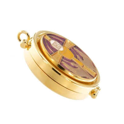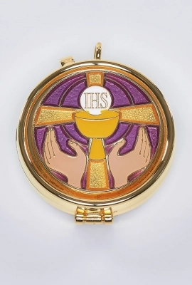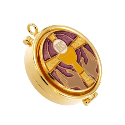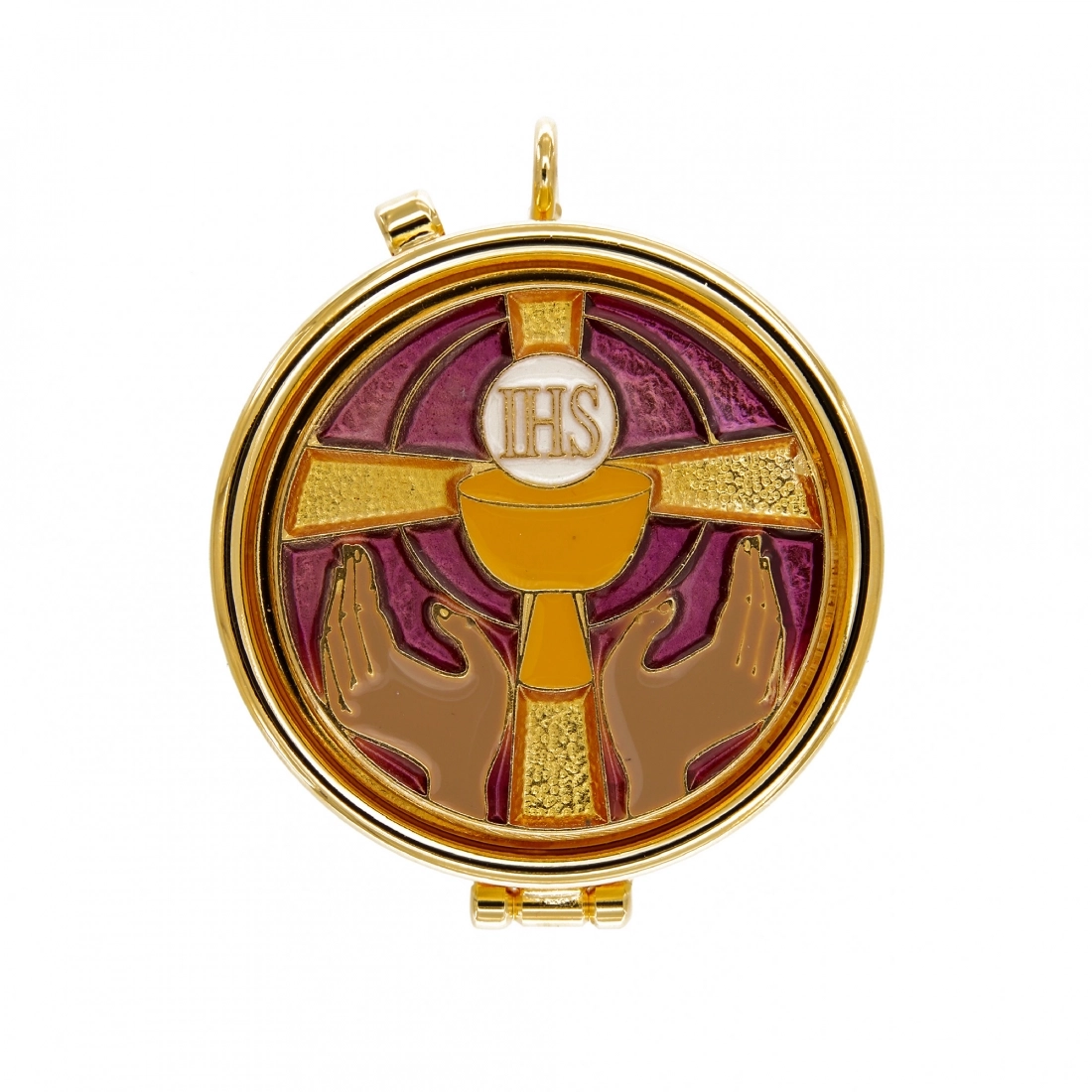Teca porta ostie con placca raffigurante il calice e le mani a benedizione, realizzata in ottone dorato. La teca eucaristica è un contenitore per la conservazione delle ostie consacrate, ovvero l'Eucaristia, tesoro più grande da condividere, dall'altare della celebrazione all'abitazione dei fedeli. Ideale anche per separare le ostie dei celiaci.