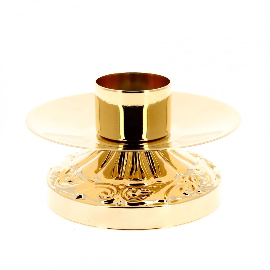 Bel candeliere stile impero realizzato in ottone dorato, con eleganti decori sulla base. Adatto a contenere candele in pvc di diametro 4 cm.