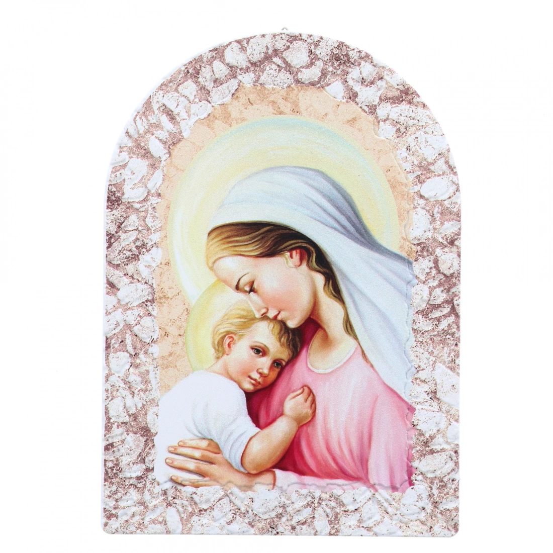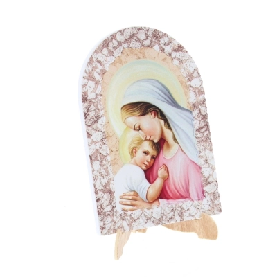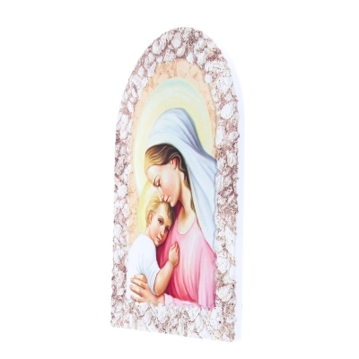 Carinissimo quadretto in resina effetto pietra, delle dimensioni di 16x23 cm, dotato di cavalletto per essere indifferentemente poggiato o appeso. E'raffigurata una dolce Madonna con Bambino. La rappresentazione della Madonna con il Bambino è un tema iconografico molto diffuso nell'arte sacra cristiana. Questa immagine raffigura la Vergine Maria con il suo bambino Gesù tra le braccia. Simboleggia la maternità divina di Maria e la sua relazione speciale con Gesù, il Figlio di Dio. La Madonna con il Bambino è spesso associata a concetti di amore materno, protezione, devozione e umanità divina. Nell'arte e nella spiritualità cristiana, questa rappresentazione è considerata un simbolo di grazia, misericordia e speranza per i fedeli.