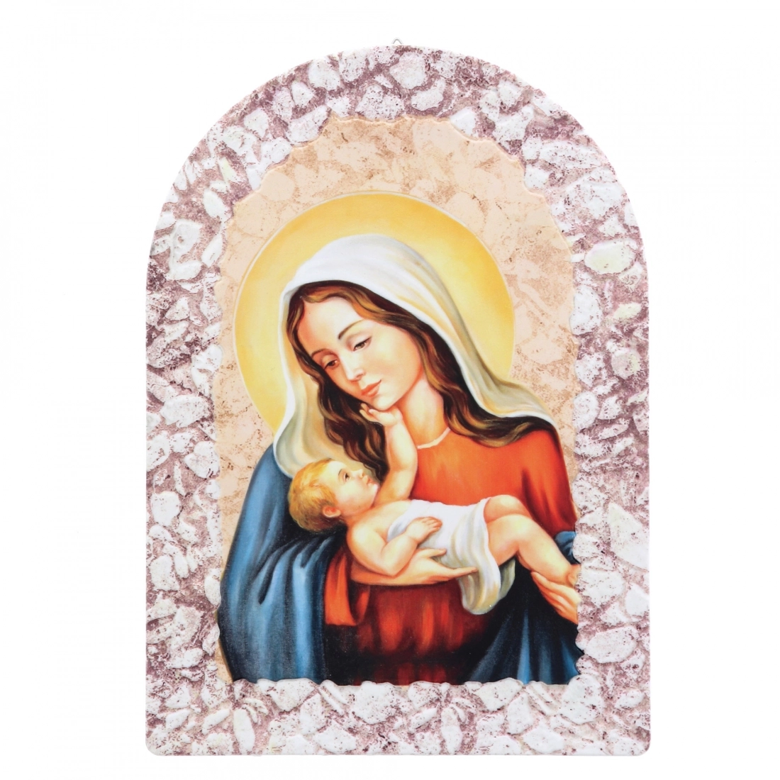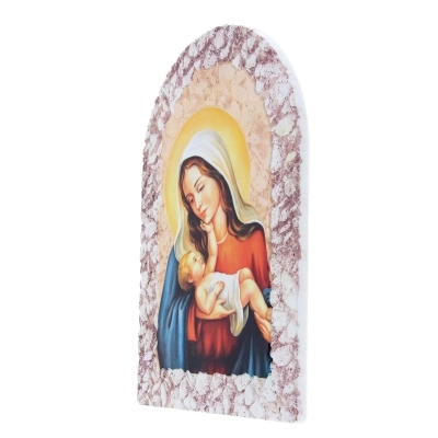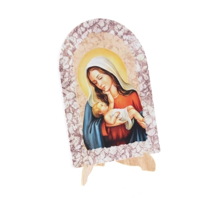 Carinissimo quadretto in resina effetto pietra, delle dimensioni di 16x23 cm, dotato di cavalletto per essere indifferentemente poggiato o appeso. E' raffigurata una dolce Madonna con Bambino, tema iconografico molto diffuso nell'arte sacra cristiana. Questa immagine raffigura la Vergine Maria con il suo bambino Gesù tra le braccia. Simboleggia la maternità divina di Maria e la sua relazione speciale con Gesù, il Figlio di Dio. La Madonna con il Bambino è spesso considerata un simbolo di amore materno, protezione e grazia divina. Nell'arte e nella devozione cristiana, questa rappresentazione è molto popolare e venerata come un'icona della sacralità e della tenerezza della relazione tra madre e figlio.