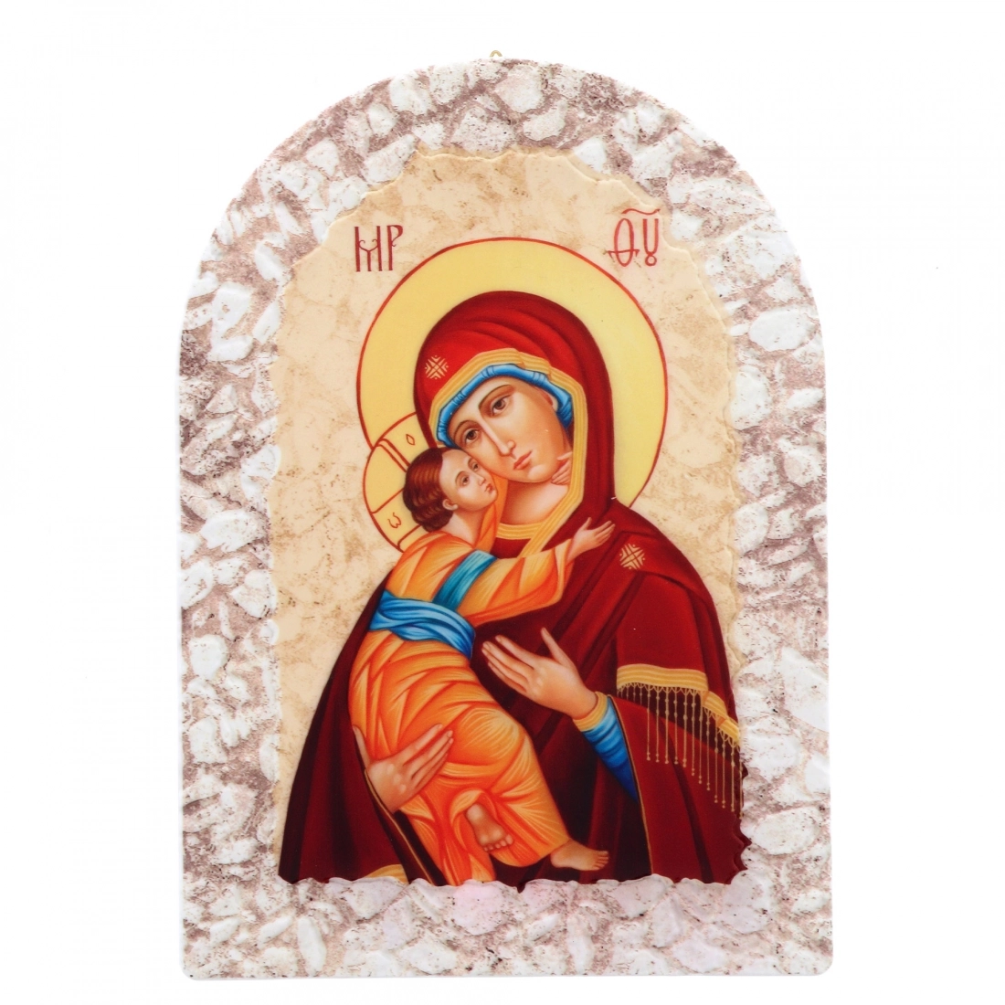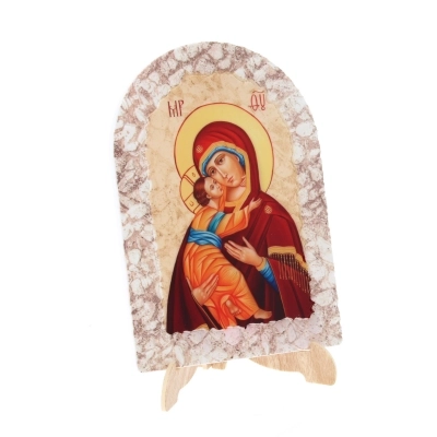 Bel quadro in resina effetto pietra, delle dimensioni di 25x36 cm, dotato di cavalletto per essere indifferentemente poggiato o appeso. E' raffigurata l'icona " Madonna con Bambino", immagine molto emblematica che è quasi una prefigurazione del Sacrificio di Gesù, cui sembrano alludere anche il volto malinconico della Madre e lo sguardo intenso e consapevole del Bambino.