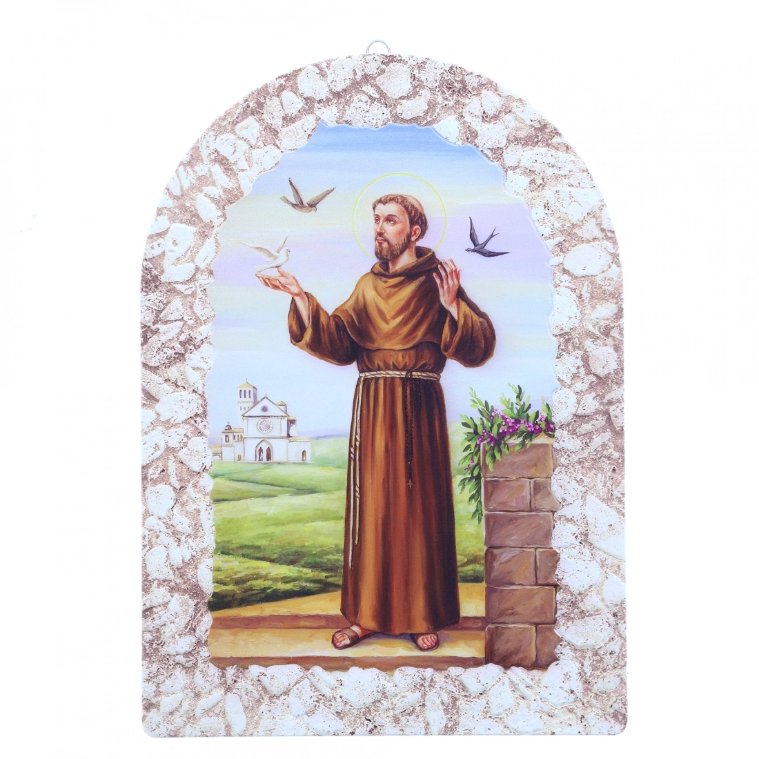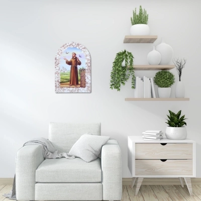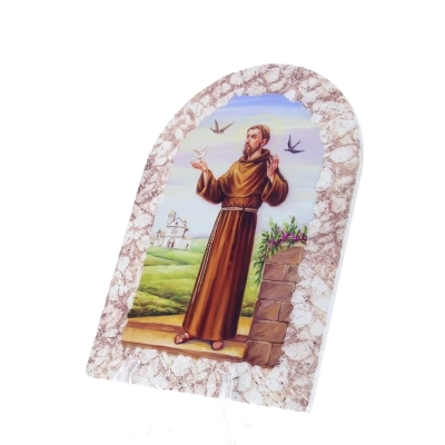 Bel quadretto in resina effetto pietra, delle dimensioni di 25x36 cm, dotato di cavalletto per essere indifferentemente poggiato o appeso. E' raffigurato "San Francesco", uno dei santi più venerati della cristianità: patrono d'Italia, voleva ripercorrere la vita povera di Cristo e degli apostoli e, come loro, mettere in pratica il Vangelo amando il prossimo e il creato.