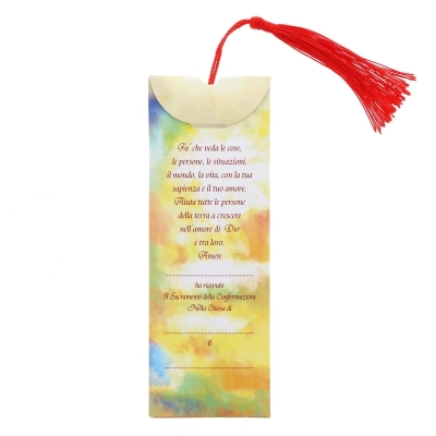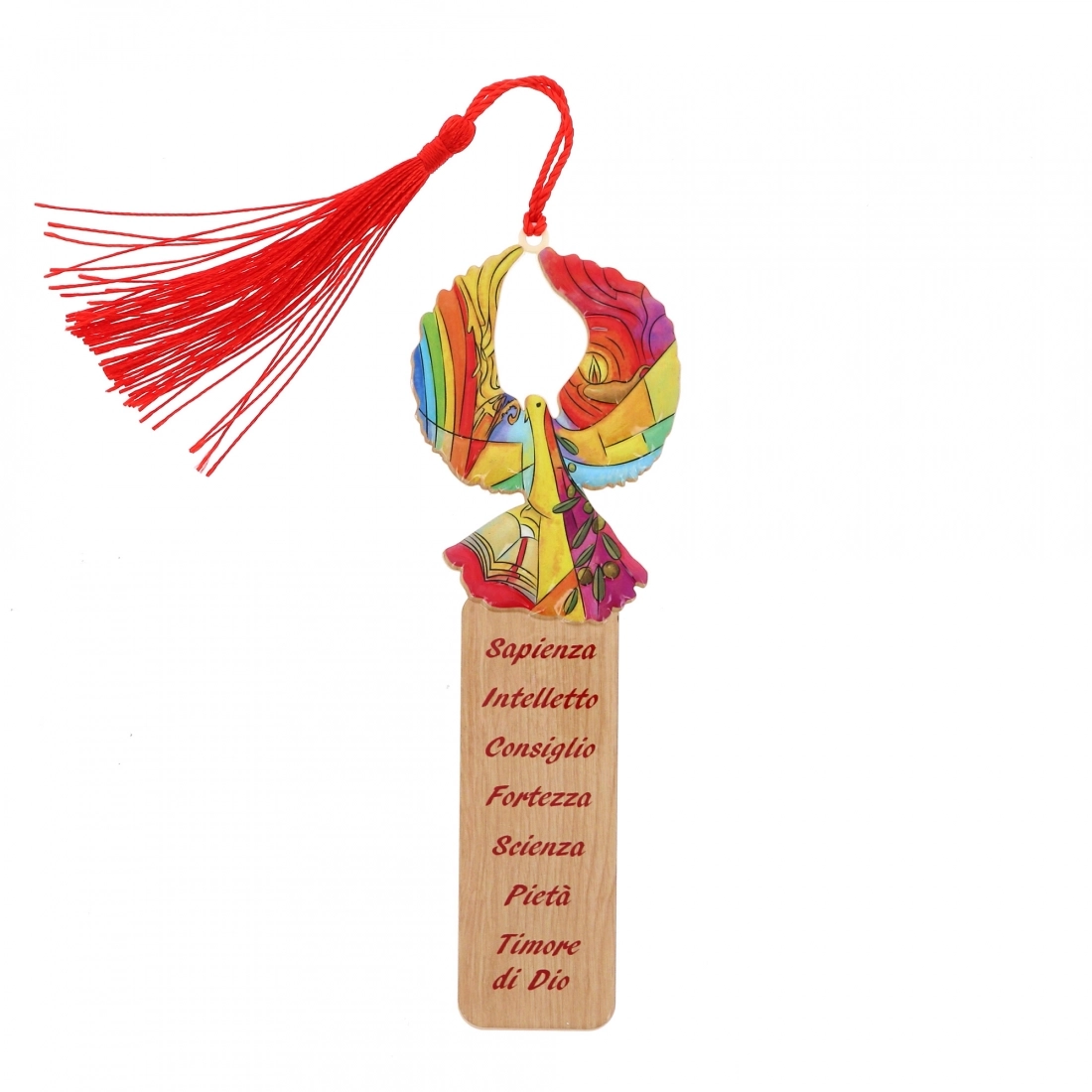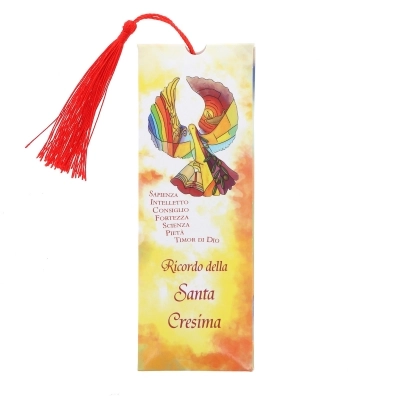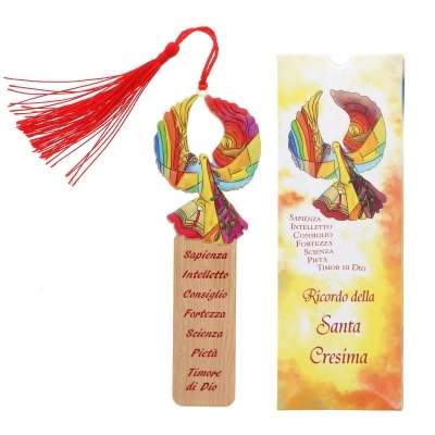 Confezione contenente un segnalibro in polimero effetto legno con i disegni simbolo della Cresima e incisi i sette doni dello Spirito Santo "Sapienza, Intelletto, Consiglio, Fortezza, Scienza, Pietà, Timore di Dio". Un dono da regalare ai ragazzi per il Sacramento della Confermazione